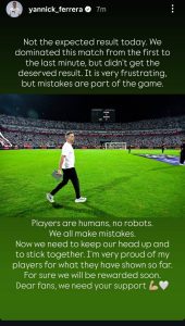 ونشر فيريرا عبر حسابه الرسمي على موقع “إنستجرام” صورة تجمعه بجماهير الزمالك، معلقًا عليها قائلاً: “لم تكن النتيجة التي كنا نطمح إليها اليوم، لقد سيطرنا على المباراة من الدقيقة الأولى وحتى الأخيرة، لكننا لم نحصل على النتيجة المستحقة. هذا أمر محبط للغاية، لكن الأخطاء جزء من اللعبة.”