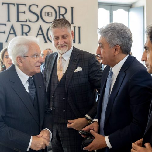 افتتح اليوم السيد سيرجيو ماتاريلا رئيس جمهورية إيطاليا، معرض “كنوز الفراعنة” المقام بقاعة Scuderie del Quirinale التابعة لمؤسسة الرئاسة الإيطالية في العاصمة روما، وذلك بحضور السيد شريف فتحي وزير السياحة والآثار المصري والسيد أليسندرو جولي وزير الثقافة الإيطالي والسفير بسام راضي سفير مصر لدى إيطاليا، والدكتور محمد إسماعيل خالد الأمين العام للمجلس الأعلى للآثار والدكتور محمد شعبان معاون وزير السياحة والآثار للتحول الرقمي والدكتور طارق العوضي المشرف علي المعرض وعدد من الوزراء الإيطاليين وكبار مديري المتاحف والشخصيات الثقافية.