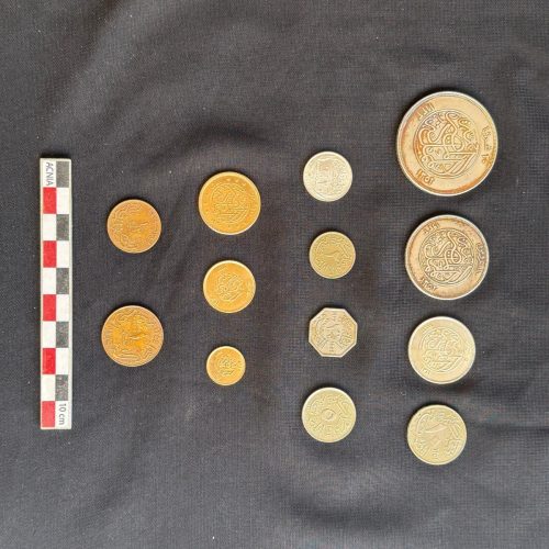 كما عثر بداخلها على ثلاث عشرة قطعة نقدية من فئات مختلفة تراوحت ما بين المليمات والعملات الذهبية من فئة 100 قرش.