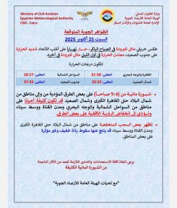 كما توقعت الأرصاد ظهور سحب منخفضة على مناطق من شمال البلاد حتى القاهرة الكبرى، قد يصاحبها سقوط رذاذ خفيف غير مؤثر، ضمن التغيرات المعتادة المصاحبة لفصل الخريف.