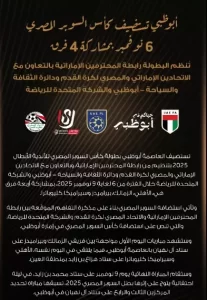 رسميا.. أبوظبي تعلن استضافة كأس السوبر المصري 6 نوفمبر 2025