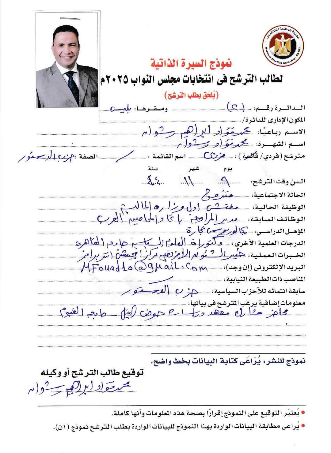 وحزب الدستور بمرشحه محمد فؤاد رشوان برمز الطائرة الهليكوبتر.