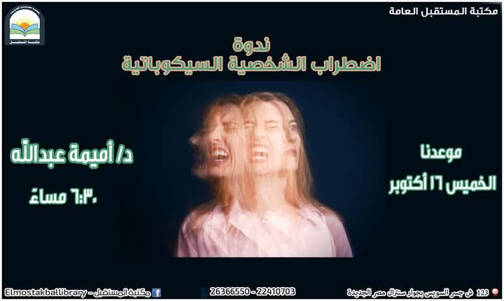 وفى سياق متصل تنظم مكتبة المستقبل أيضا فى الساعة السادسة من مساء غد الخميس ندوة “اضطراب الشخصية السيكوباتية ” تحاضر فيها دكتورة أميمة عبدالله، دكتوراه الصحة النفسية والإرشاد النفسي من جامعة عين شمس.