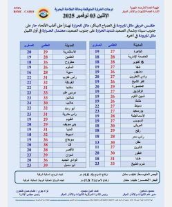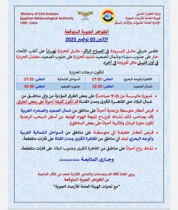 كشفت الهيئة العامة للأرصاد الجوية عن تفاصيل حالة الطقس ودرجات الحرارة المتوقعة ليوم غد الإثنين 3 نوفمبر 2025، مؤكدة استمرار الأجواء الخريفية المعتدلة على أغلب مناطق الجمهورية مع فرص لسقوط أمطار متفاوتة الشدة، ونشاط للرياح على بعض المناطق.