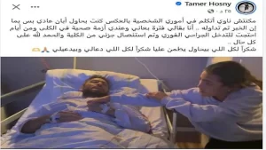 وأضاف: “أواجه منذ فترة مشاكل صحية مرتبطة بالكلى، وأدى الأمر إلى ضرورة التدخل الجراحي الفوري منذ أيام.. الحمد لله تم استئصال جزء من الكلية، وأنا الآن في فترة التعافي”.