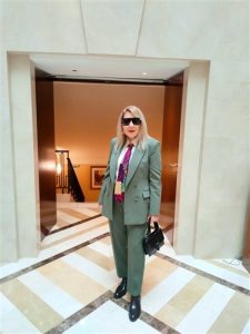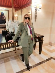 ونسقت الجندي إطلالتها بربطة عنق تحمل مزيجًا من الألوان الزاهية، مع حذاء أسود كلاسيكي ونظارة شمسية أنيقة، كما تركت شعرها الأشقر منسدلًا على كتفيها في مظهر يجمع بين الأناقة والثقة.