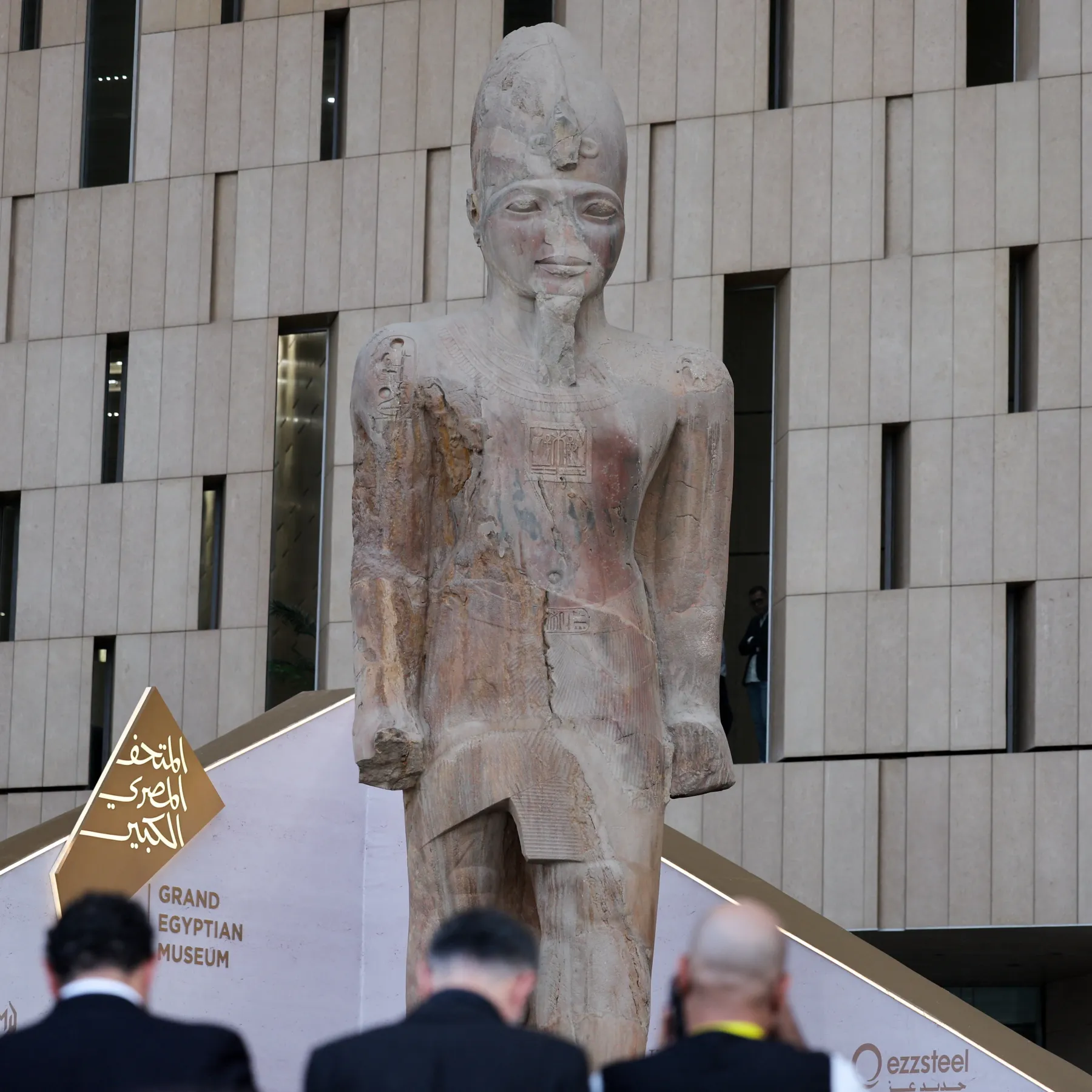 في قلب القاعة الكبرى، يقف تمثال رامسيس الثاني بحجمه الهائل، محاط بضوء يسلِّط عليه الأضواء، في أول ظهور له في موقع متحف