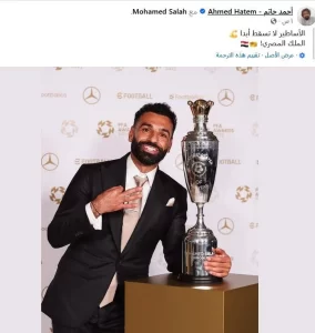 ونشر حاتم صورة لصلاح عبر صفحته على موقع فيسبوك، كما شاركها مع متابعيه على إنستجرام وعلق عليها: “الأساطير لا تسقط أبدا.. الملك المصري”، في رسالة واضحة تعكس وقوفه بجانب اللاعب في هذه الفترة الحساسة.