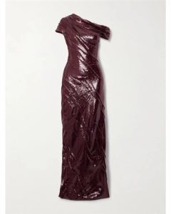 ظهرت أسماء جلال بفستان بنفسجي فاخر من تصميم مرمر حليم، جاء بقَصّة ضيقة وانسيابية أبرزت جمال قوامها، ومصنوع من قماش الكريب المزين بالترتر اللامع الذي أضفى عليه بريقًا خاصًا على السجادة الحمراء.