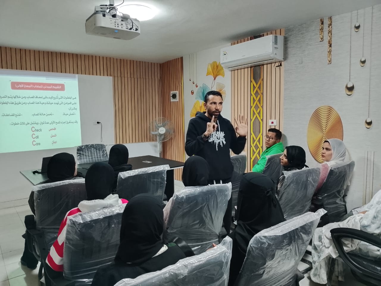 الدورة شملت شرحًا عمليًا لكيفية التعامل مع الإصابات الطارئة، الإغماء، الحروق، الجروح، والكسور، إلى جانب تدريب مباشر على مهارات الدعم الأساسي للحياة، وقدّم المادة العلمية المحاضر الأستاذ أحمد عيد عتريس.