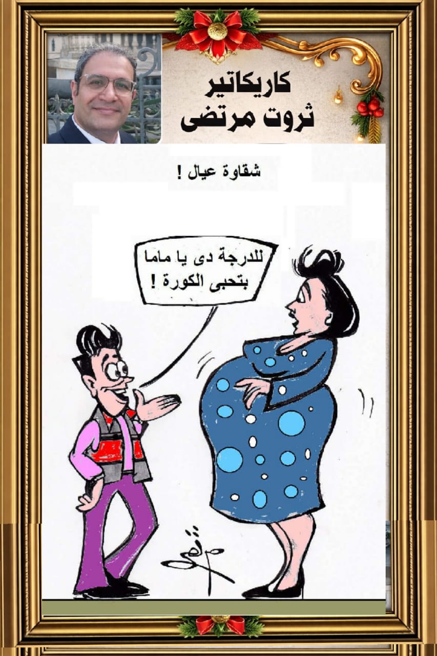 ويظهر في الكاريكاتير زوج يداعب زوجته الحامل التي ترتدي فستاناً مزيناً بدوائر تشبه الكرات، قائلاً لها في دهشة ساخرة: “للدرجة دي يا ماما بتحبي الكورة!”، في إسقاط طريف يربط بين شكل الحمل وشغف التشجيع، وكأن الجنين نفسه يستعد لمباراة قادمة.