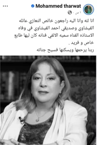 وكتب محمد ثروت في منشوره ناعيًا الفنانة الراحلة: “إنا لله وإنا إليه راجعون، خالص التعازي لعائلة الفيشاوي وصديقي أحمد الفيشاوي في وفاة الأستاذة الفنانة سمية الألفي، فنانة كان ليها طابع خاص وفريد، ربنا يرحمها ويسكنها فسيح جناته”.