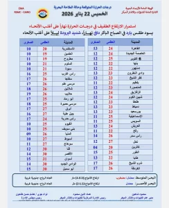 توقعت هيئة الأرصاد الجوية، أن تشهد البلاد، الخميس، حالة من التقلبات الجوية، حيث يسود طقس دافئ على أغلب الأنحاء خلال ساعات النهار، بينما يميل إلى الحرارة على مناطق جنوب الصعيد، في حين تنخفض درجات الحرارة بشكل ملحوظ ليلًا، لتسود أجواء شديدة البرودة على معظم المحافظات، وهو ما يستدعي توخي الحذر خاصة في الساعات المتأخرة من الليل والصباح الباكر.