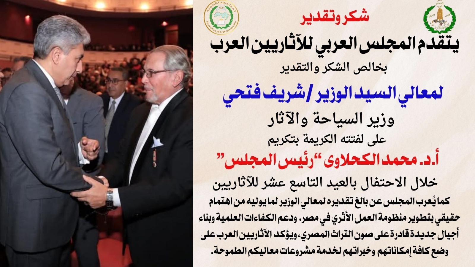 وأرسل اليوم الدكتور محمد الكحلاوي رئيس مجلس الآثاريين العرب خطاب شكر للسيد شريف فتحي وزير السياحة والآثار هذا نصه: