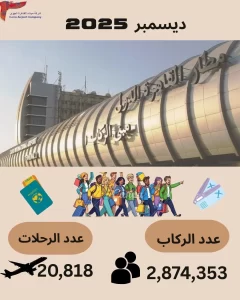 كما سجل مطار القاهرة الدولي ارتفاعًا ملحوظًا في أعداد الركاب، حيث بلغ إجمالي عدد المسافرين خلال شهر ديسمبر 2025 نحو 2.87 مليون راكب، مقابل 2.52 مليون راكب خلال الفترة نفسها من العام السابق، بمعدل نمو وصل إلى 14%.