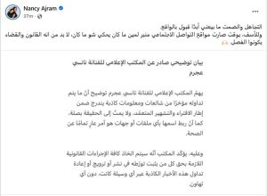 وجاء في البيان أن هذه المزاعم تندرج تحت إطار الافتراء والتشهير المتعمد، ولا تمت للحقيقة بصلة، مشددًا على أن ربط اسم نانسي عجرم بأي ملفات أو جهات مشبوهة هو أمر غير صحيح على الإطلاق.