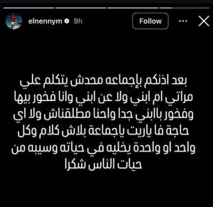 وكتب اللاعب الدولي في تدوينة واضحة اللهجة: «بعد إذنكم يا جماعة محدش يتكلم على مراتي أم ابني ولا عن ابني وأنا فخور بيها وفخور بابني جدًا وإحنا مطلقناش ولا أي حاجة فـياريت ياجماعة بلاش كلام وكل واحد أو واحدة يخليه في حياته ويسيبه من حياة الناس شكرا».