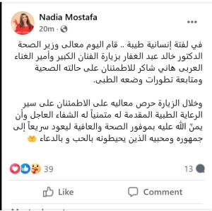 وأوضحت نادية مصطفى في منشور عبر حسابها الرسمي على موقع التواصل الاجتماعي “فيسبوك” أن زيارة وزير الصحة جاءت في إطار لفتة إنسانية تعكس حرص المسؤولين على دعم الرموز الفنية في مصر، مشيرة إلى أن الوزير حرص على متابعة الحالة الصحية للفنان هاني شاكر عن قرب والاطمئنان على مستوى الرعاية الطبية المقدمة له داخل المستشفى.
