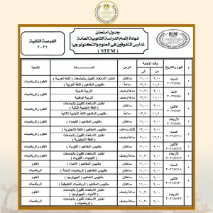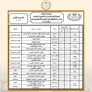 بالنسبة لطلاب مدارس المتفوقين في العلوم والتكنولوجيا “STEM”، فقد تقرر أن تبدأ امتحانات الفرصة الأولى يوم 16 مايو 2026، وتستمر حتى 20 يونيو 2026. أما امتحانات الفرصة الثانية، فتنطلق يوم السبت 4 يوليو 2026، وتستمر حتى يوم 22 يوليو 2026، في إطار إتاحة أكثر من فرصة للطلاب لإثبات تفوقهم العلمي.